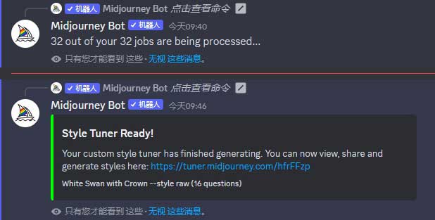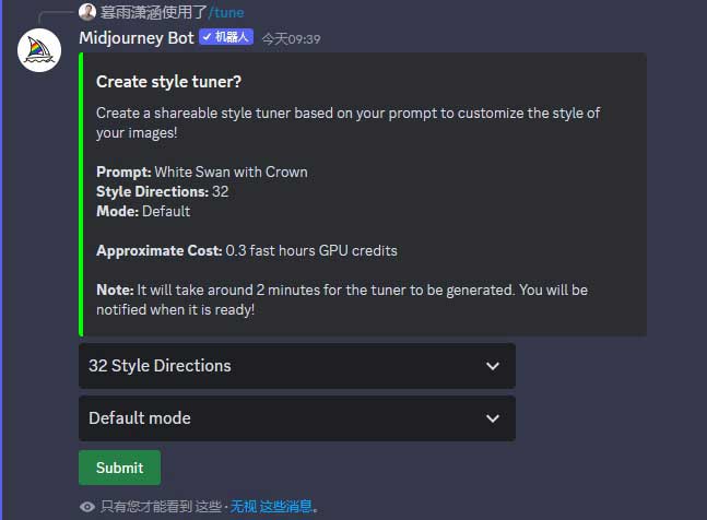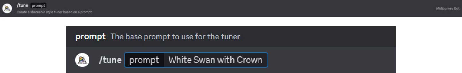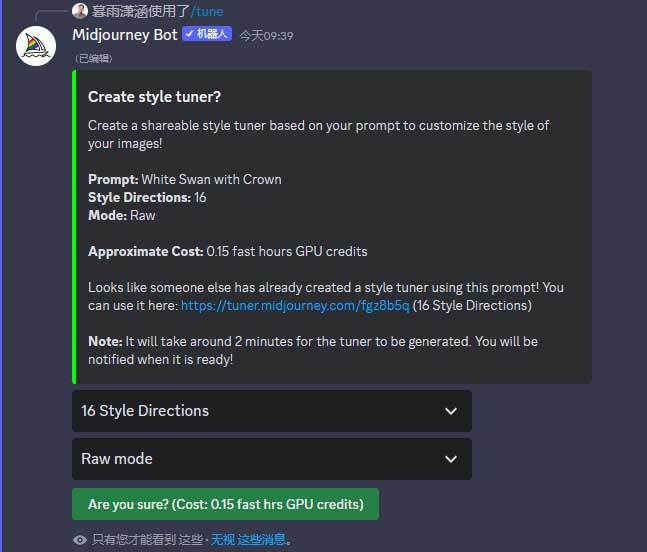 步骤1 在输入框中,用英文输入法输入“/”,然后选择“/tune”指令,输入描述语“White Swan with Crown”(一只戴着王冠的白天鹅),按Enter键发送消息,如图2-33所示。