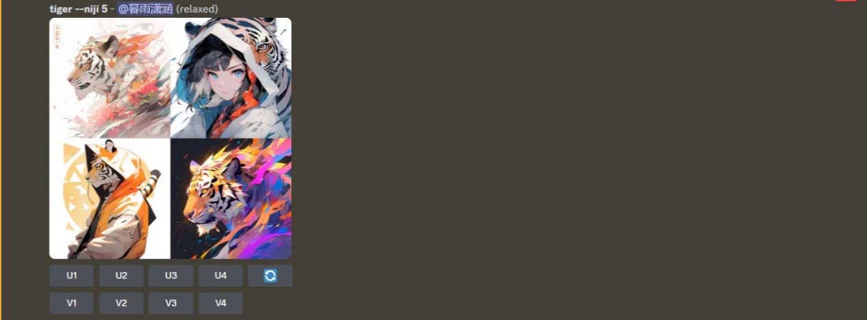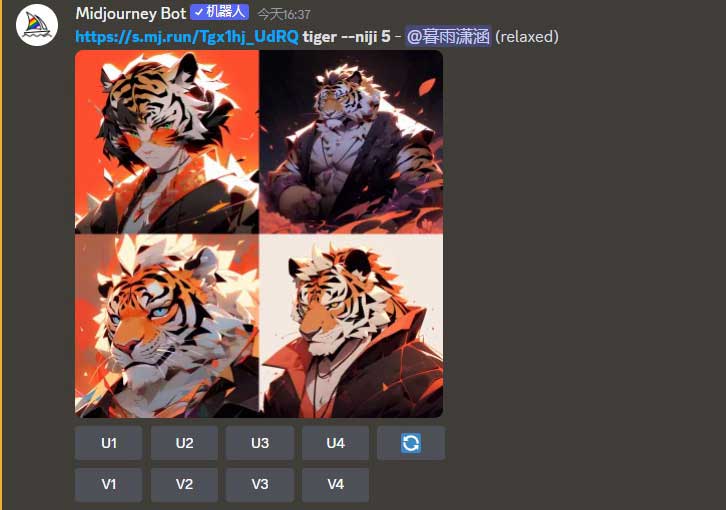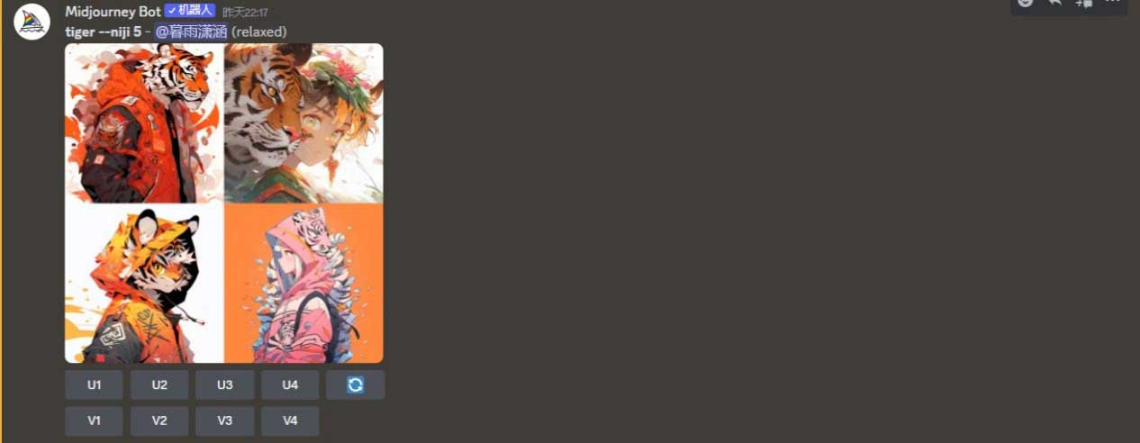 选择Niji Model V5版本,在“/imagine prompt”指令后输入tiger,按Enter键发送,Midjourney生成的动漫图像如图2-4所示。