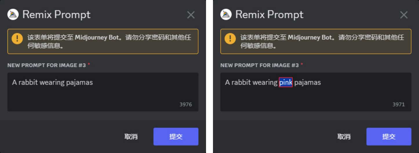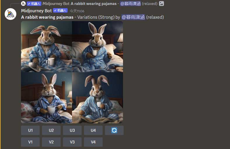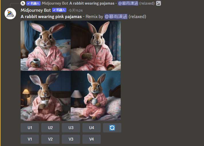 (混合模式)按钮,使其呈高亮选中状态,如图2-20所示。接着单击图2-18中的V3按钮,此时便会出现提示语弹窗,我们可以修改关键词来调整画面细节,例如,加入关键词“pink”(粉色),如图2-21所示,Midjourney使用新的描述语“A rabbit wearing pink pajamas”(一只穿着粉色睡衣的兔子),并延续3号图像风格输出一组新变体图像,如图2-22所示。