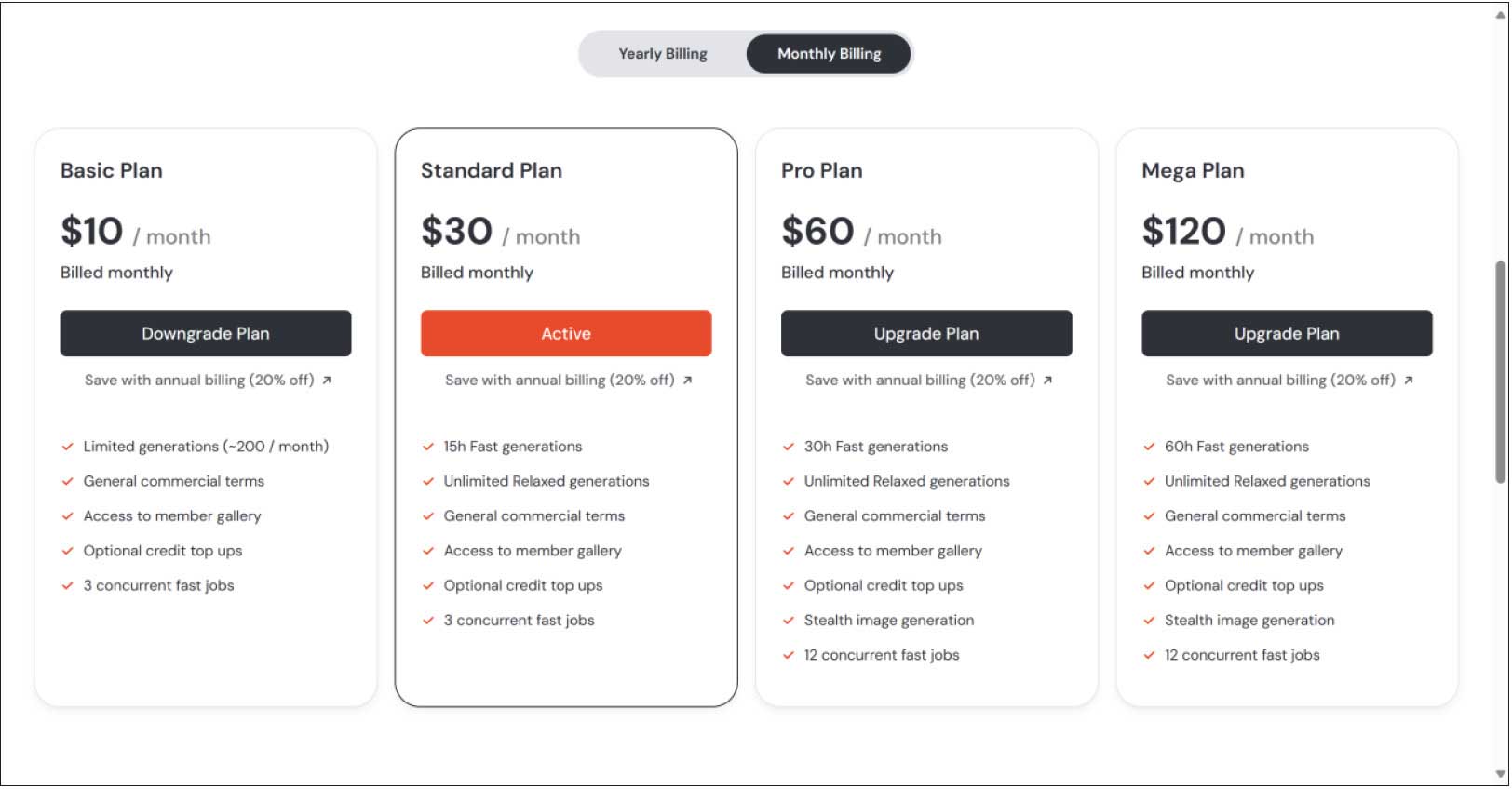 Turbo mode(涡轮模式)比Fast mode(快速模式)出图更快,快速出图模式服务于标准计划及以上的订阅会员,且按照订阅分级享有不同的快速时长,如图2-42所示。Relax mode(放松模式)的出图速度根据服务器情况而定,出图较慢。快速时长为GPU运行时间而非在线时长。我们可以选择在服务器拥挤的时段启用快速模式提高刷图效率,在服务器空闲时段切换为放松模式。