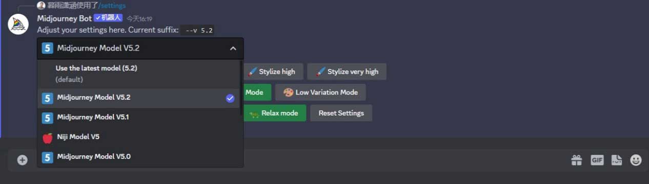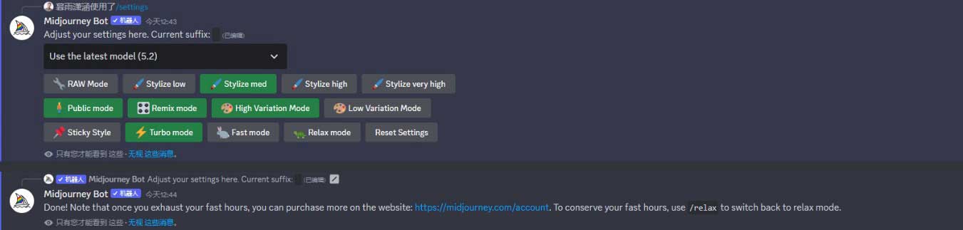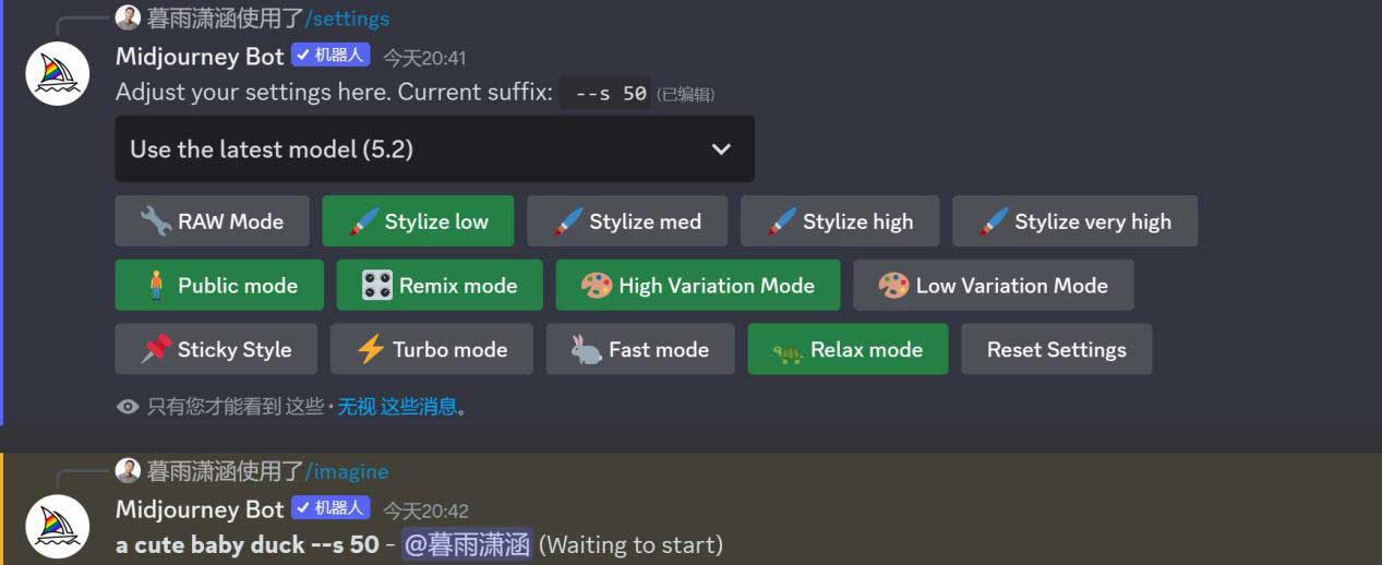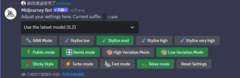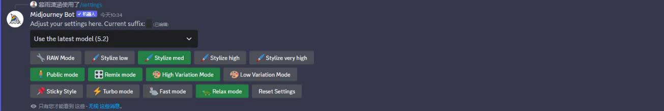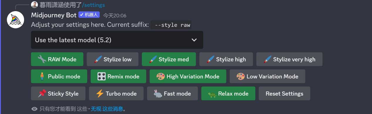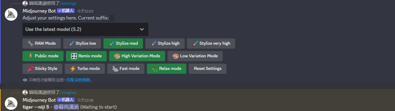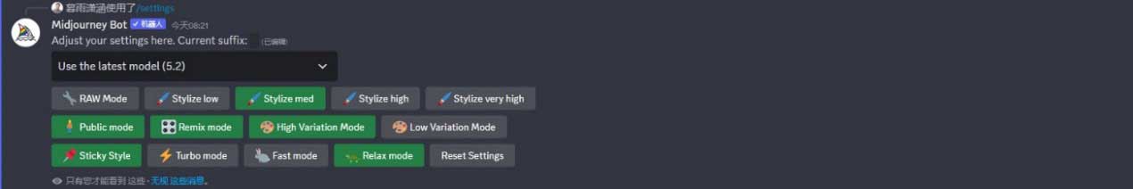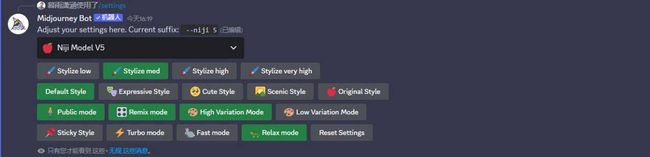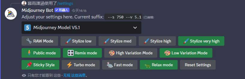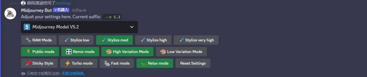 我们可以通过“/settings”(设置)指令选择模型版本,进行图像风格化及差异化的预设,或切换出图模式。