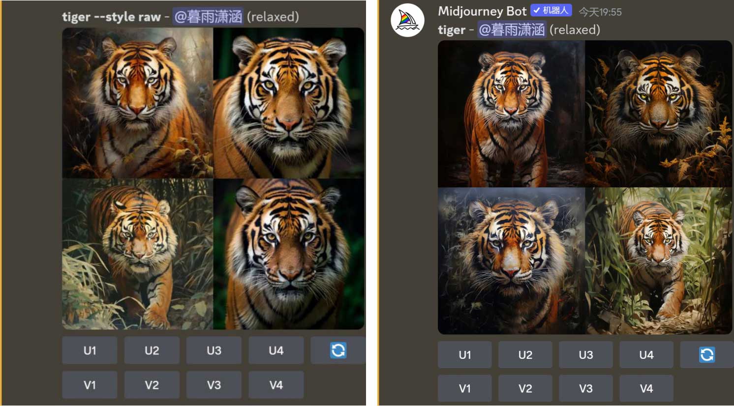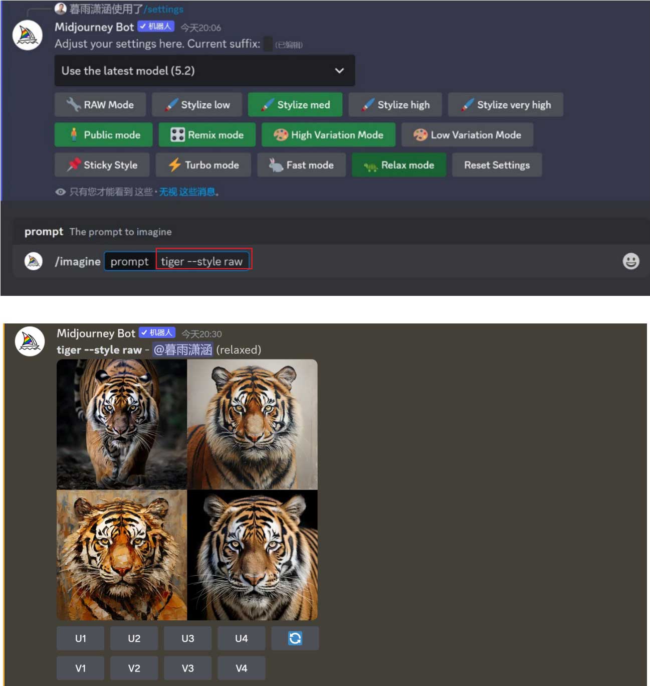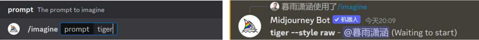 按钮,使其高亮显示,如图2-10所示,接着在提示语框中输入“tiger”(老虎),按Enter键发送消息,Midjourney会自动在描述语后面添加后缀参数“--style raw”,如图2-11所示。