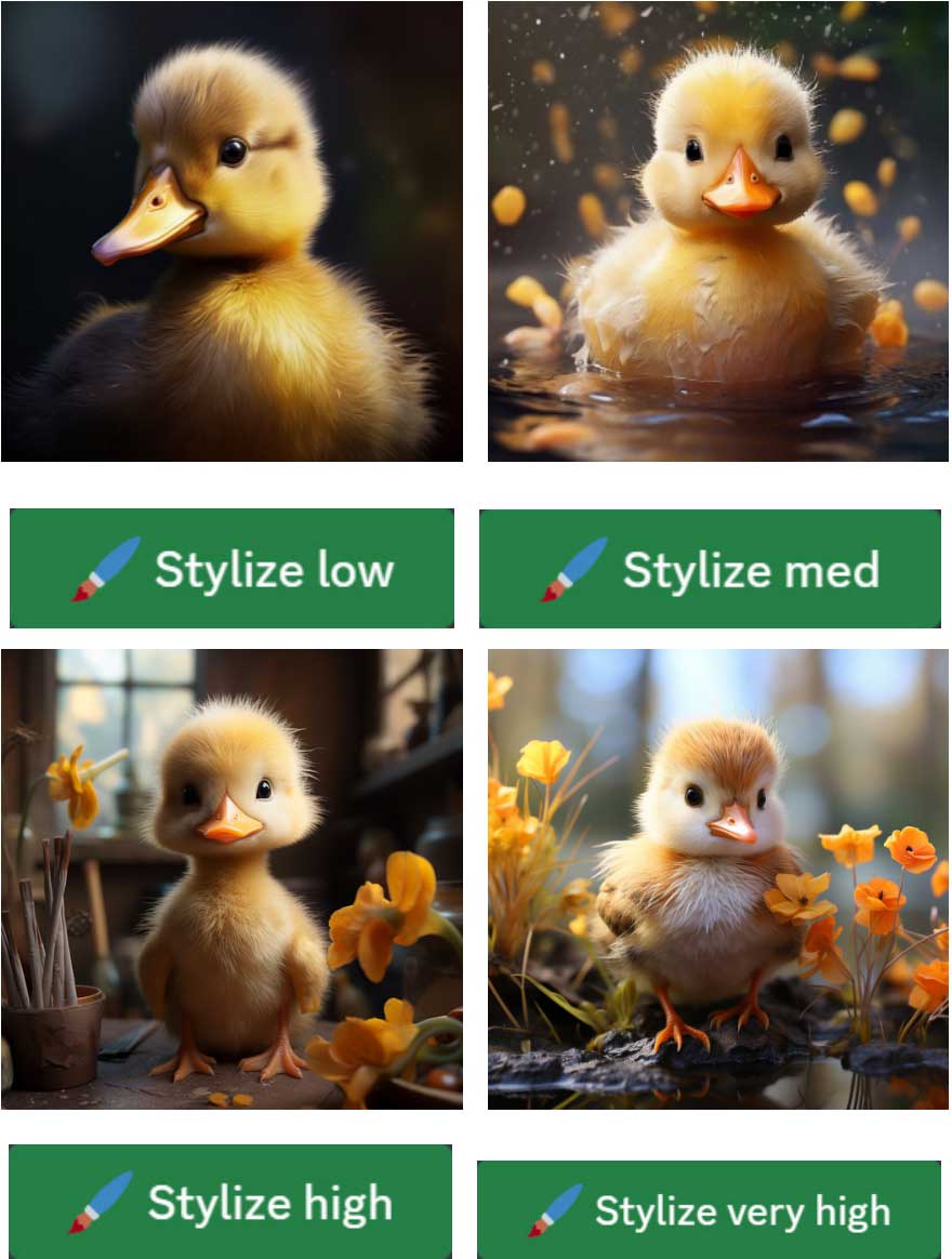 我们选择“Stylize low”(低风格化),在提示语框中输入“a cute baby duck”(一只可爱的小鸭子),按Enter键发送消息后,Midjourney自动在描述语后面添加了后缀参数“--s 50”,如图2-14所示。经过测试,我们得出“Stylize high” (高风格化)对应“--s 250”,“Stylize very high” (非常高风格化)对应“--s 750”,“Stylize med” (中风格化)对应“--s 100”,是风格化默认值,所以当选择“Stylize med”(中风格化)时,Midjourney不会再添加后缀参数。