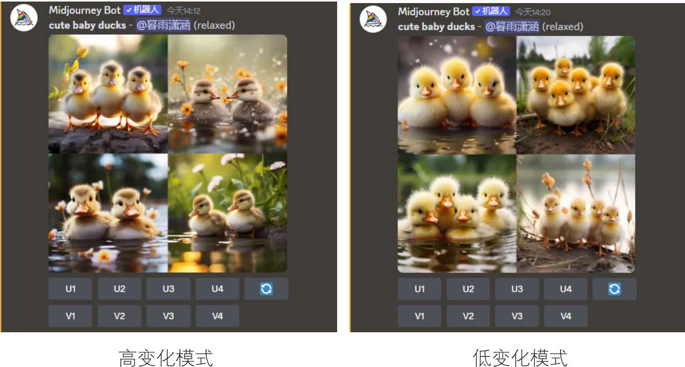使用描述语“cute baby ducks”(可爱的小鸭子),Midjourney生成的图像如图2-26所示。选择“High Variation Mode”(高变化模式)生成的四格图像在画面布局、镜头角度、主体形象上的差异较大。相反,选择“Low Variation Mode”(低变化模式)的四格图像看起来更统一。