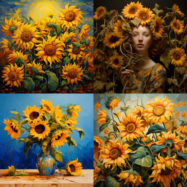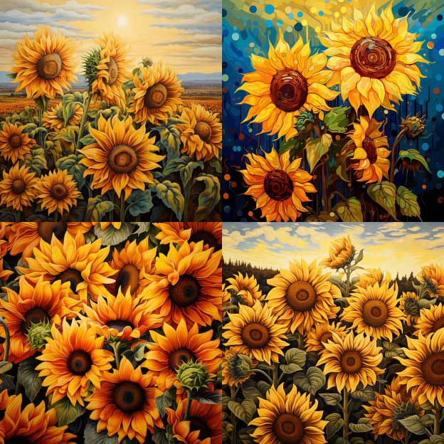输入“sunflowers”(向日葵),选择“High Variation Mode”(高变化模式),呈现出的四格图像绘图风格差异大,如图2-27所示。选择“Low Variation Mode”(低变化模式)则图像相似度较高,如图2-28所示。