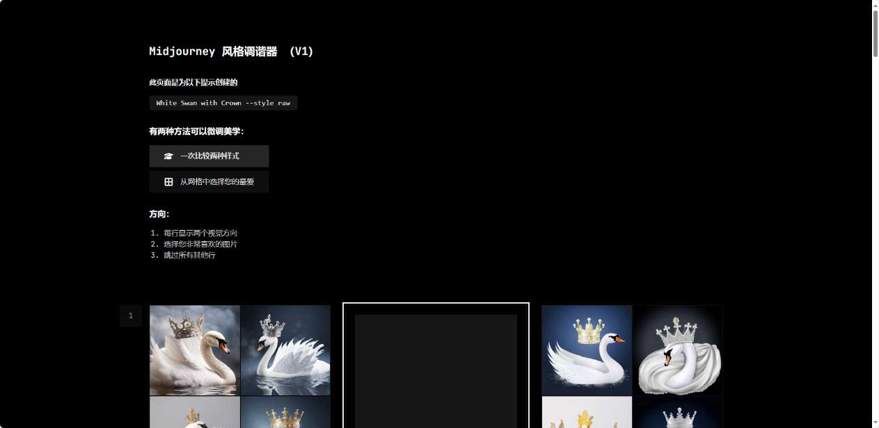 步骤4 在风格调谐器页面中,选择一个或多个风格的图像后,在页面底部信息栏中单击右侧的“复制”按钮,即可完成“--style”参数的复制,如图2-39所示。风格调谐器页面默认为二选一模式,也可以通过单击“田字格”图标切换为大网格模式进行样式挑选,如图2-40所示。