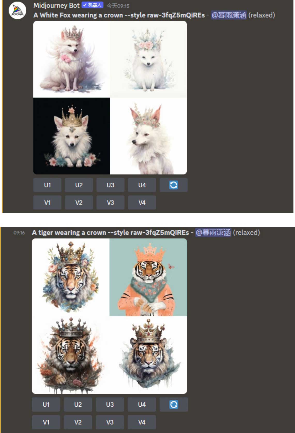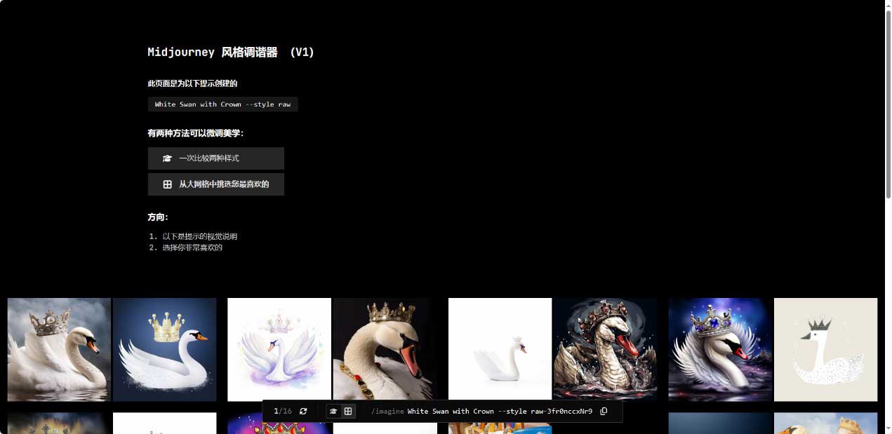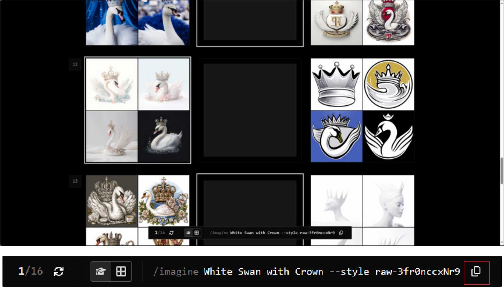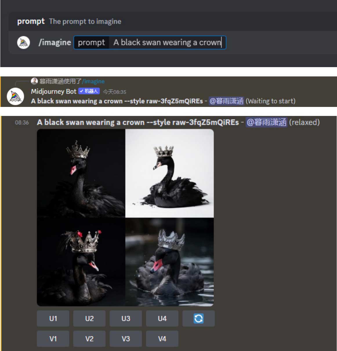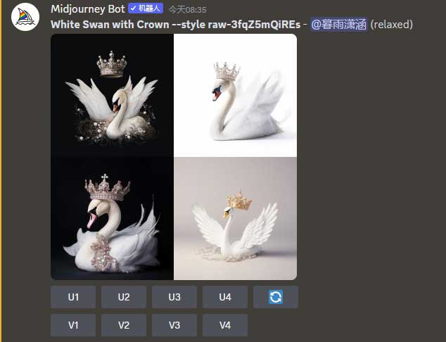 步骤3 在“/imagine prompt”输入框中输入任意内容的描述语,如输入“A black swan wearing a crown”(一只戴着王冠的黑天鹅),按Enter键发送消息后,Midjourney自动在描述语末尾添加“--style raw-3fqZ5mQiREs”后缀参数以输出类似风格的新图像,如图2-31所示。