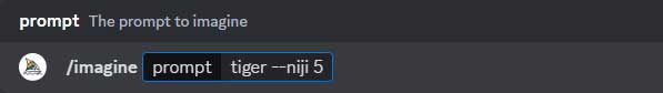 选择默认版本Midjourney Model V5.2,如图2-5所示,在tiger关键词后面留一空格(英文输入状态),手动输入后缀参数“--niji 5”,完整描述语为“tiger --niji 5”,接着按Enter键发送消息,如图2-6所示。Midjourney同样会调取Niji模型生成动漫风格图像,如图2-7所示。