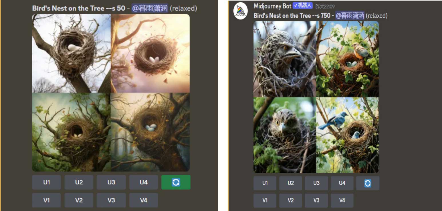 以“Bird's Nest on the Tree”(树上的鸟巢)为例,对比出图效果,如图2-16所示。“Stylize” (风格化)等级低的图像只能绘制出巢和蛋,与描述语更接近。使用高等级的“Stylize” (风格化)选项,Midjourney输出的画面细节更多,内容更丰富。