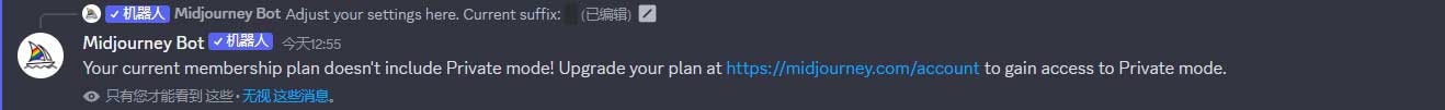 打开“Public mode”(公开模式)意味着我们的图像在Midjourney网站上将被其他人看到。若尝试取消该模式,系统会发送升级订阅的提示消息,如图2-17所示。假设我们已享有隐私模式权限,则可以通过“/stealth”指令快速切换。