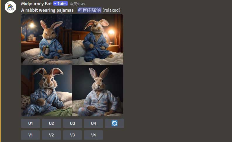使用“Remix mode”(混合模式)可以激活提示语弹窗,实现对描述语的二次修改,达到微调画面的目的。以描述语“A rabbit wearing pajamas”(一只穿着睡衣的兔子)生成的图2-18为例,未选中“Remix mode”(混合模式)时,单击图像下方的V3按钮,Midjourney会直接输出一组3号图像风格的新变体图像,如图2-19所示。