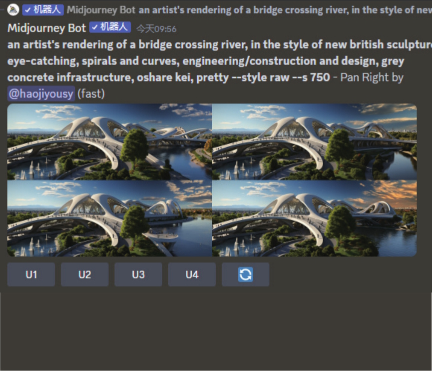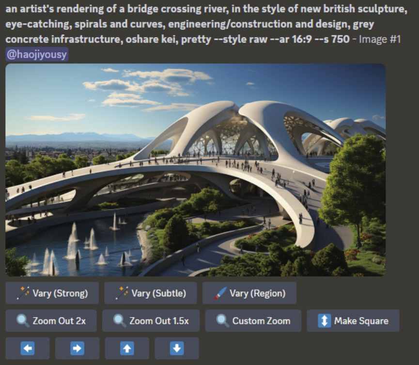 这意味着,对于初级Midjourney用户来说,在撰写提示词时,不必过于纠结关于景别的单词是否描述准确,只要获得局部图像,就可以通过Zoom Out功能得到全景图像。但对于高级用户来说,必须要清晰的是,使用这种方法获得的全景图像与使用正确的全景景别提示词,所获得的图像在透视效果上有较大的区别。