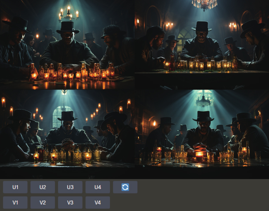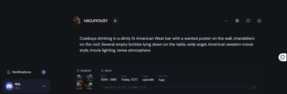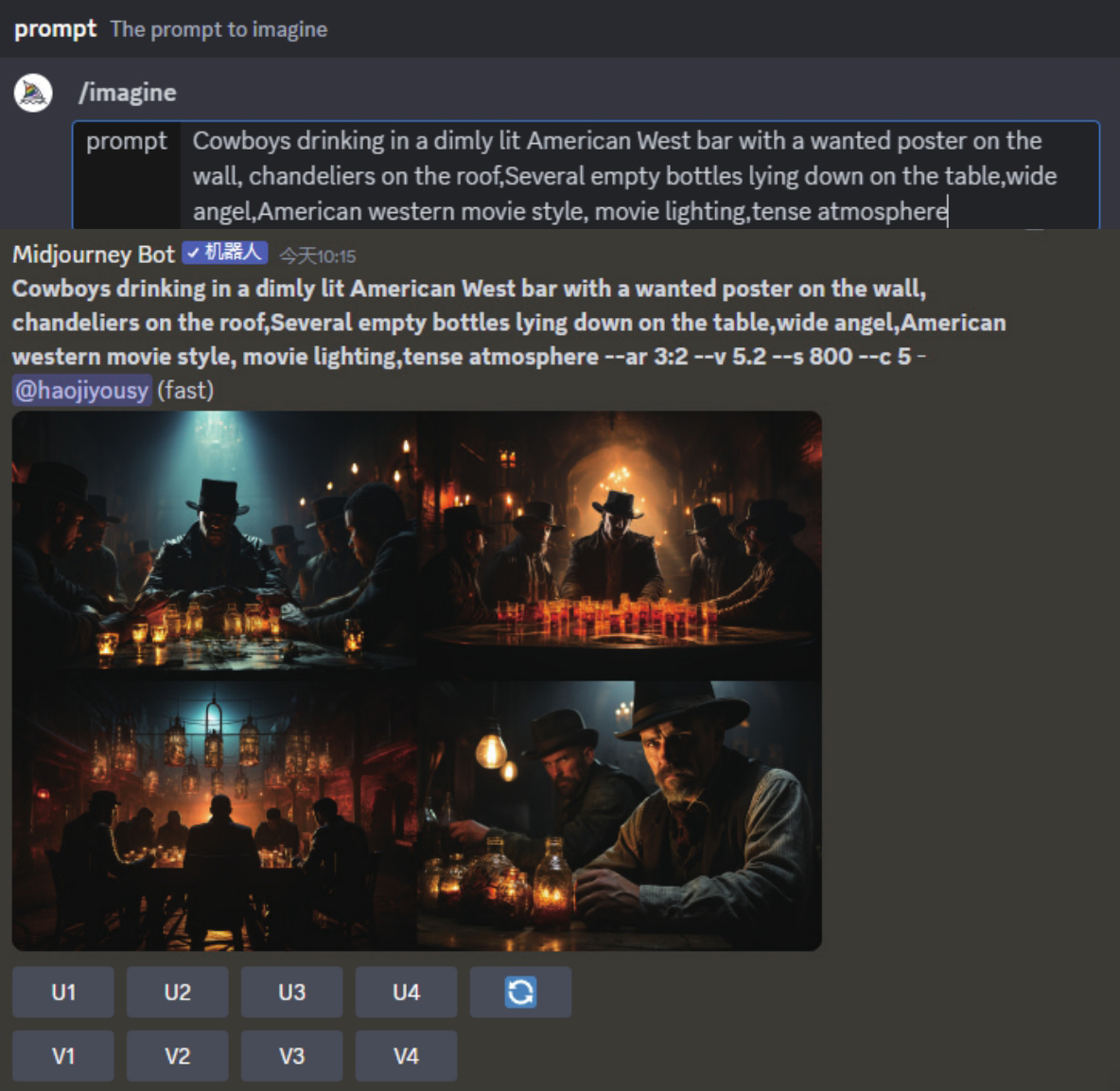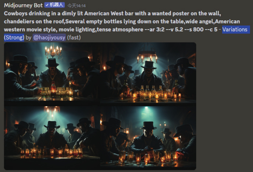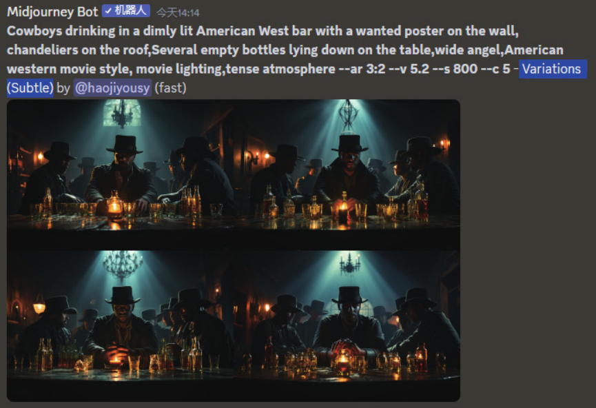在/imagine命令下面的英文部分Cowboys drinking in a dimly lit American West bar with a wanted poster on the wall, chandeliers on the roof,Several empty bottles lying down on the table,wide angel,American western movie style, movie lighting,tense atmosphere用于描述图像。