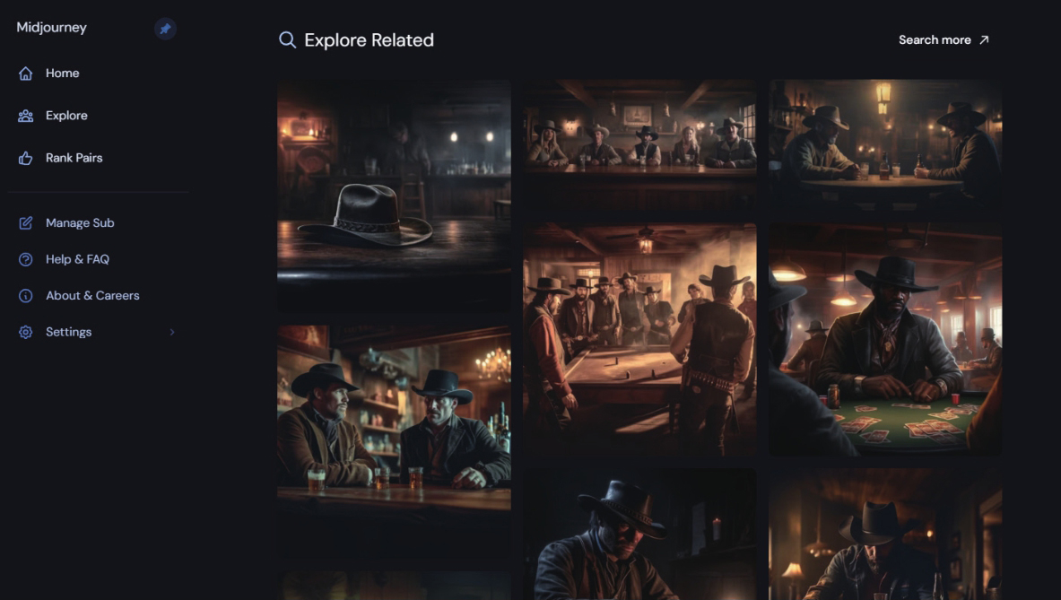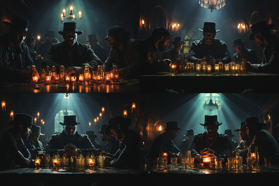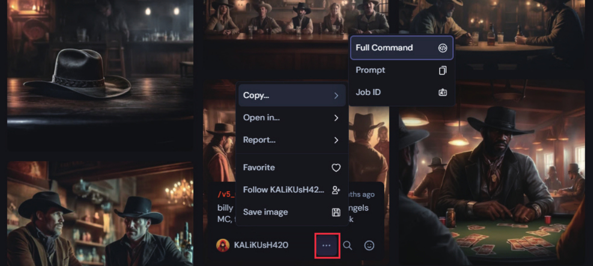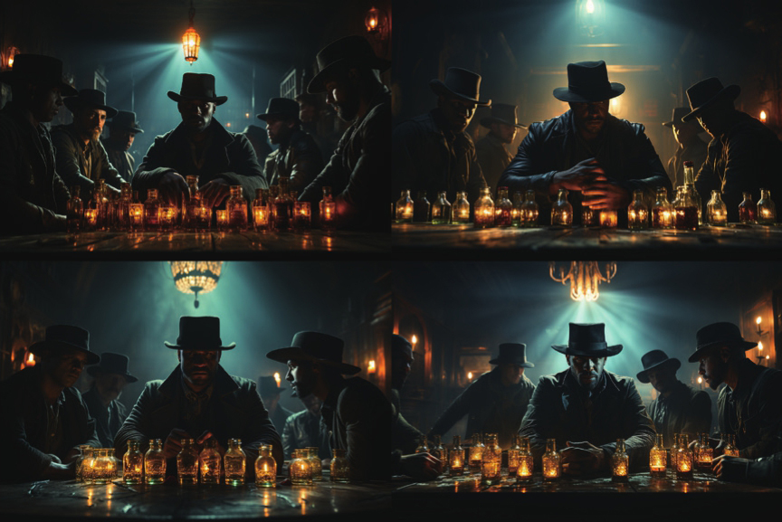 在/imagine命令下面的英文部分Cowboys drinking in a dimly lit American West bar with a wanted poster on the wall, chandeliers on the roof,Several empty bottles lying down on the table,wide angel,American western movie style, movie lighting,tense atmosphere用于描述图像。