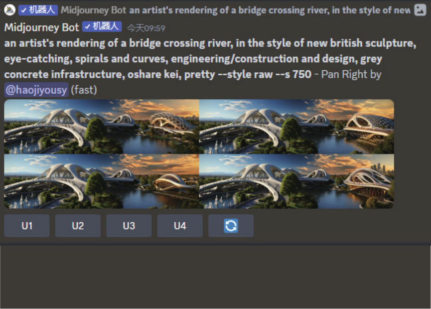 但需要注意的是,目前Midjourney不支持对同一图像同时在垂直及水平方向上扩展。因此,当单击向右箭头按钮后,在生成的大图下方只能看到两个水平方向的按钮,如下左图所示。