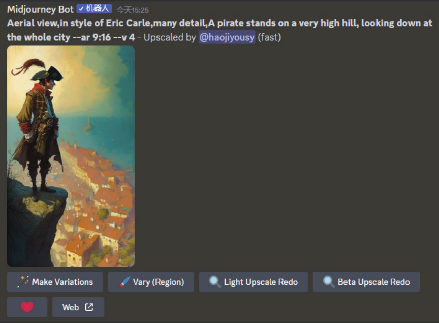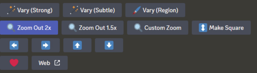 在Midjourney中,放大生成的旧作品后,下方的按钮如右图所示,可以看出来没有Vary(Region)按钮。因此,即使在作品列表中找到了旧作品,也无法使用这些新的功能。