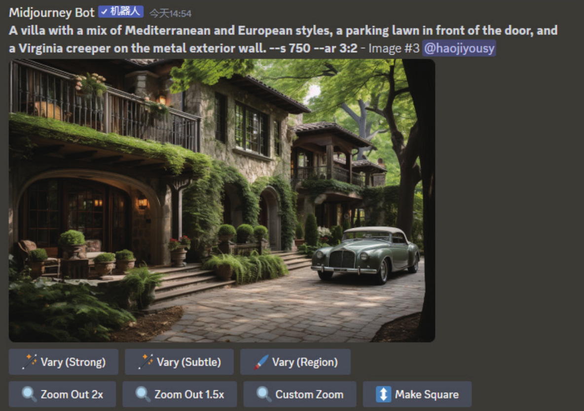Zoom Out功能的使用方法是,先按常规方法获得4幅初始图像,单击U#按钮生成大图。然后单击图像下方的Zoom Out 2x或Zoom Out 1.5x按钮,如下图所示。如果希望获得其他的放大倍率,单击Custom Zoom按钮,并在--zoom后面填写1.0~2.0的数值。