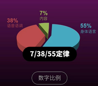 如图10-5所示,这是沟通技巧中经典的73855定律,它是指在沟通说话过程中,这种说话的内容效果的比例只占百分之七,而语音语调能够影响百分之三十八,身体语言可以影响到百分之五十五,用这种数字来表示一种规律。