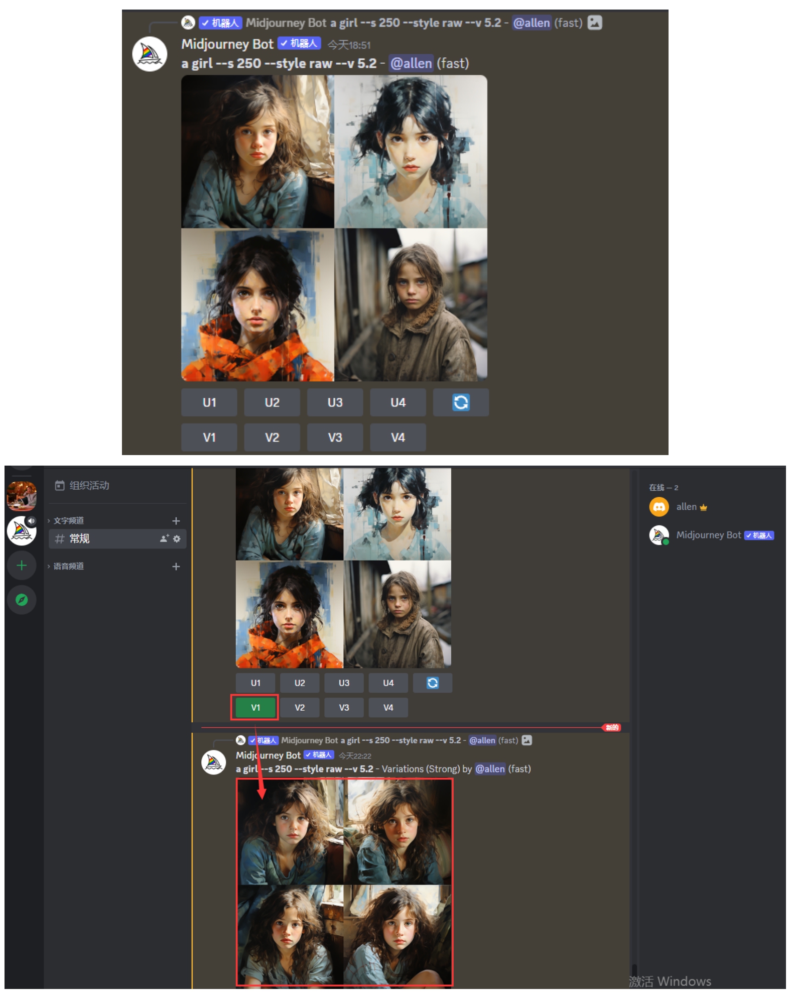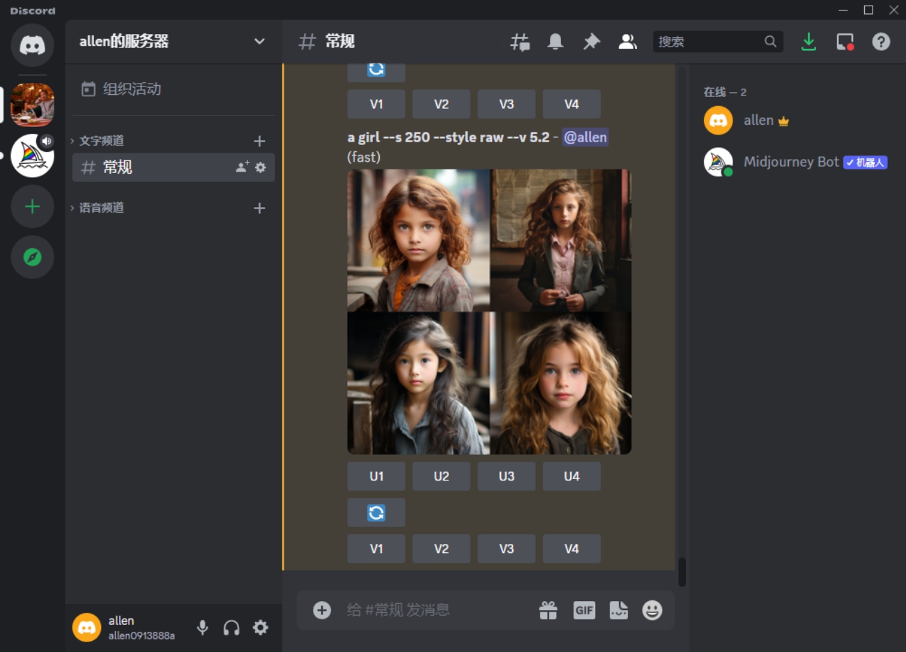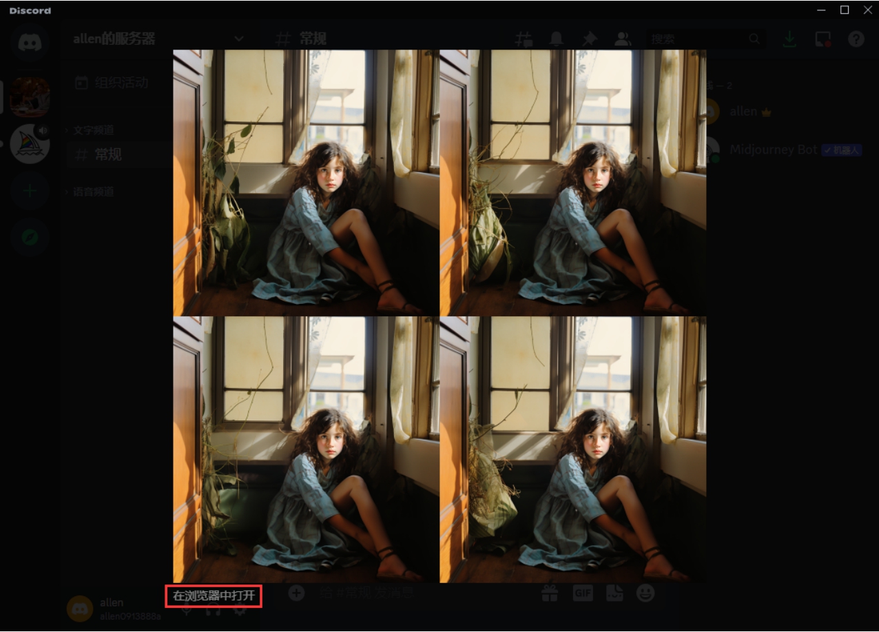 (2)在/image prompt后面的输入框中输入英文关键词,就可以生成想要的图片。可以使用翻译软件将我们的想法翻译成英文。例如,生成一个女孩,可输入a girl。按Enter键,就会出现4幅连续的图像,如图3.3所示。