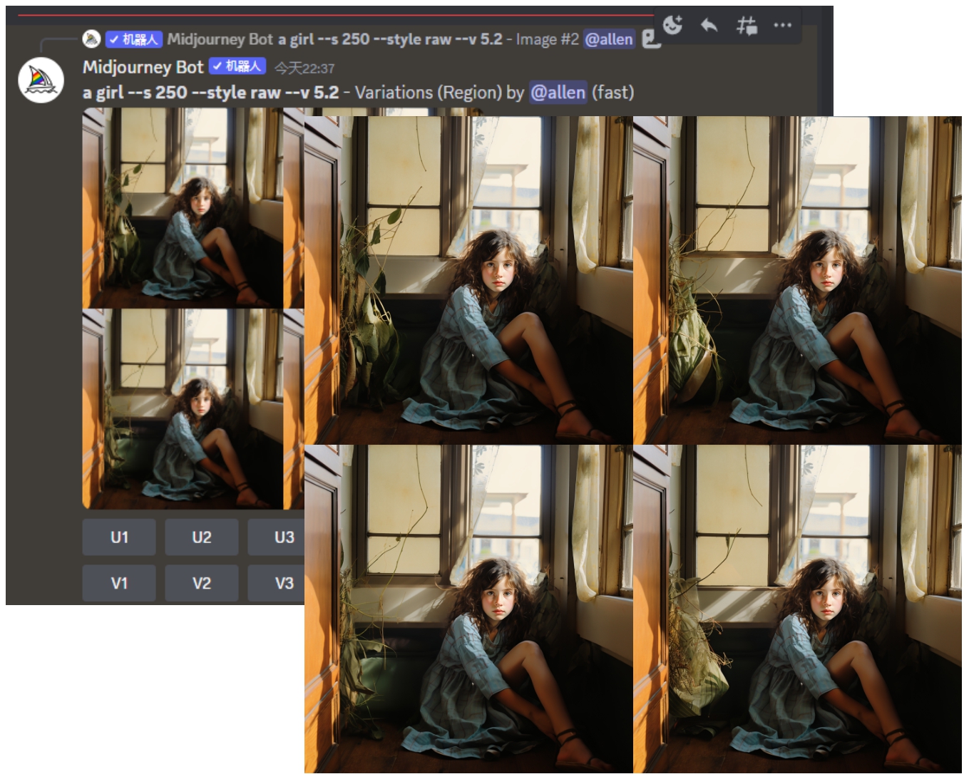 生成的AI图像下方标有U1、U2、U3和U4共4个按钮,分别对应4幅图片。其中,U表示放大(Upscale),如果喜欢第一幅图片,可单击U1按钮,Midjourney会自动放大U1图像,如图3.6所示。