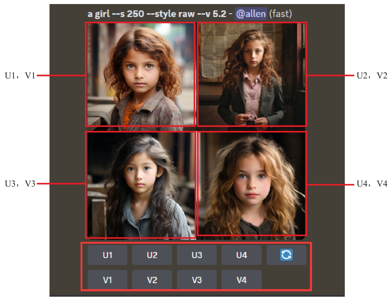 按钮用于重新生成图像,单击该按钮会创建4幅全新的图像。V(Variations的缩写)按钮是根据用户选择的图像进行变化,单击V按钮会创建4幅新的图像,它们的整体风格、颜色、构图与用户选择的图像相似,如图3.5所示。