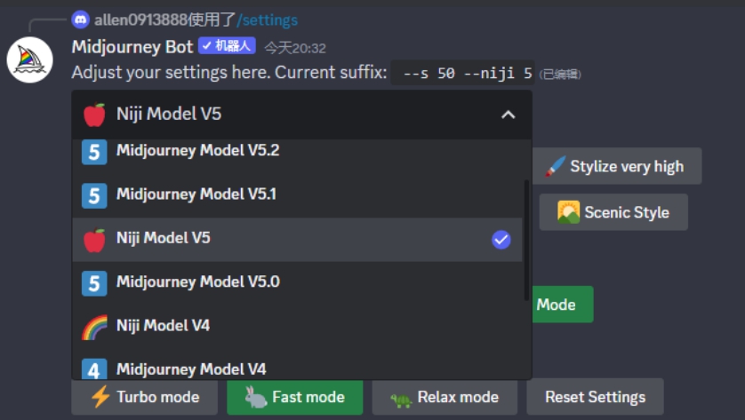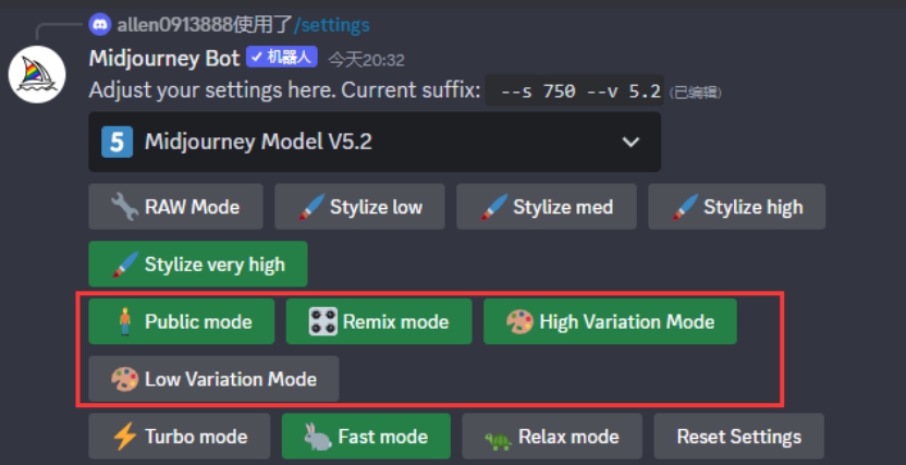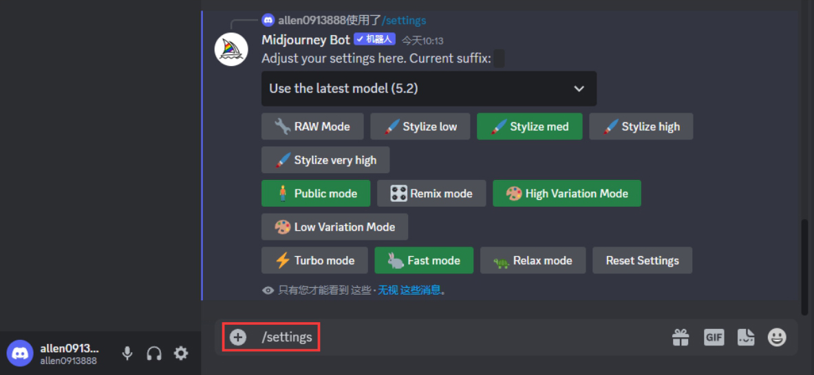 在Midjourney的描述语输入框中输入/settings,按Enter键即可进入图像的偏好设置界面。灰色的是我们没有选择的功能,绿色的是正在生效的功能,如图3.13所示。