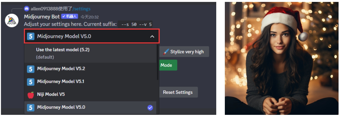 Midjourney Model V1.0、V2.0和V3.0是之前的版本,出图更加抽象,具有艺术的朦胧感;V4.0比较写实、真实细腻;V5.0及以上版本更写实、AI感降低(系统默认为最高版本),如图3.14所示。
