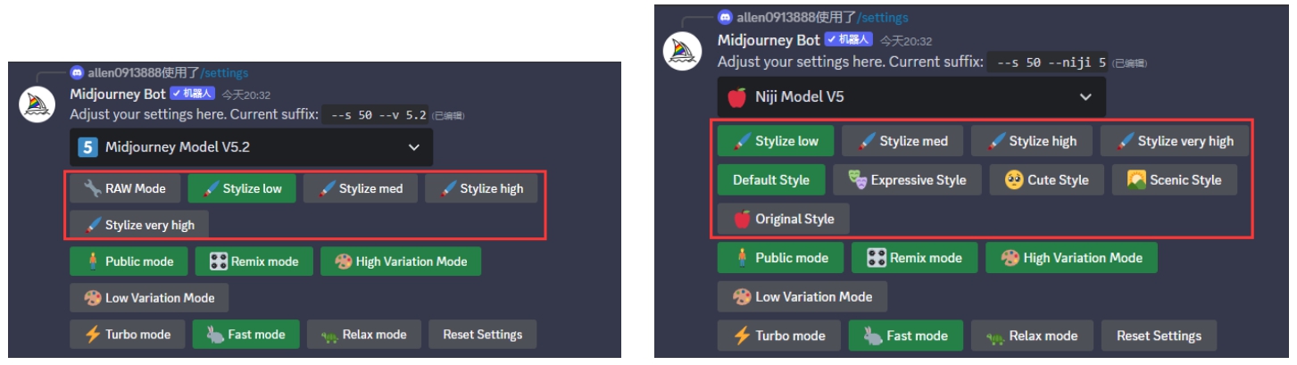 Stylize代表风格化程度,风格化越强,图片越具有创造性、越抽象。Niji Model V5增加了几种特殊风格,分别是Default Style(正常风格)、Expressive Style(表现型风格)、Cute Style(可爱风格)、Scenic Style(优美风格)和Original Style(原生风格),如图3.18所示。