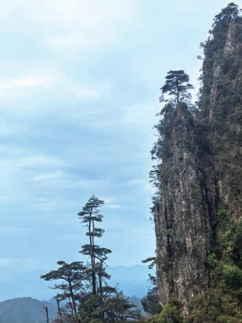 在五指峰景区,一条栈道悬挂在数百米高、笔陡的绝壁上,下面是万丈深渊。栈道对面,耸立着一座一座造型奇特的山峰。其中有一座,如人伸出的五个指头,指向天幕,故称五指峰。同行的朋友老蔡,恐高,在悬挂于绝壁的栈道上行走,不敢往下看,身子紧靠着岩壁,小心翼翼地攀着石岩,缓缓地朝前挪动脚步。为了一睹前面的美景,他没有后退,硬是走到观景台,美美地观赏了对面的几座奇峰怪岭后才返回。