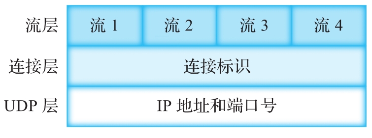 QUIC分层是在UDP层上面叠加了自己的两个层次——连接层和流层,具体分层如图2-1所示。