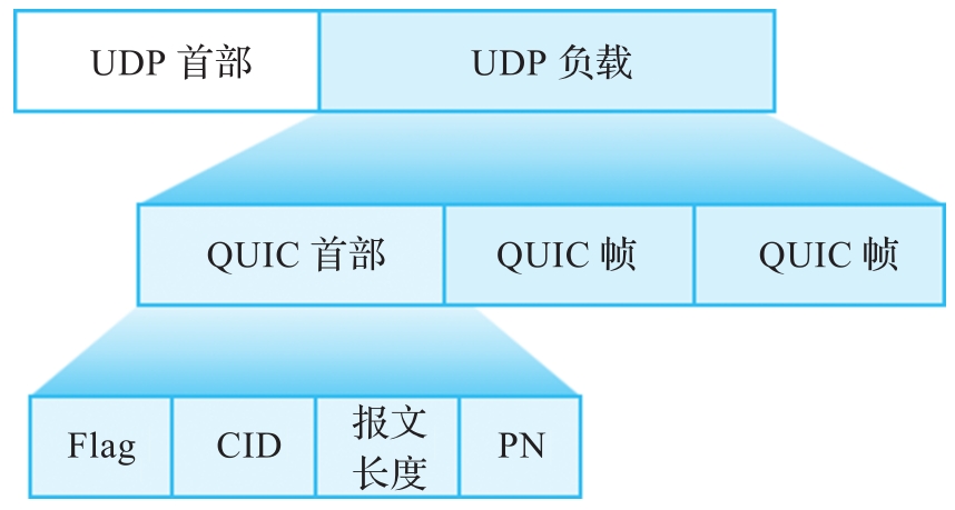 使用QUIC的应用可以打开/关闭流、在对应流上收发数据。QUIC协议将应用的数据封装在STREAM帧中,和QUIC协议自身的其他QUIC语义的帧封装成QUIC报文一起发送,典型的QUIC报文如图2-2所示。图2-2中Flag是8位,包含了QUIC的一些标识位,CID是QUIC的连接标识(Connection ID),报文长度是可选的,PN是报文的编号(Packet Number)。