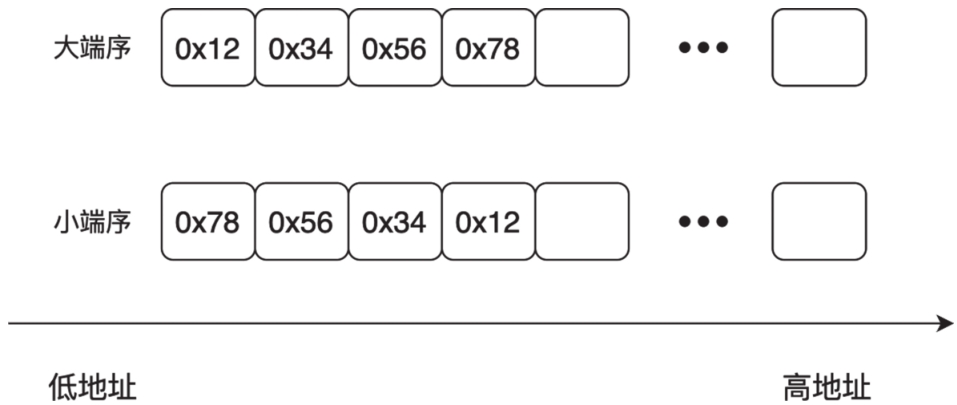 小端序(Little-endian)是指将低位字节存储在低地址,而高位字节存储在高地址。例如,对于0x12345678,小端序的存储方式为0x78,0x56,0x34,0x12。在计算机系统中,通常使用小端序,因此小端序也被称为“主机字节序”。大端序和小端序的区别如图2-1所示。