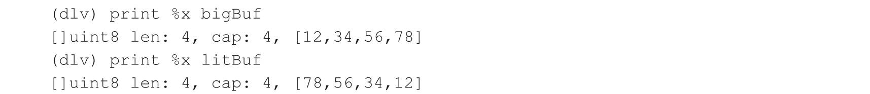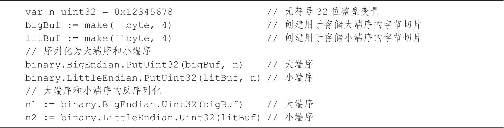 在Go语言中,标准库binary提供了字节端序的相关功能,可以实现大端序和小端序之间的序列化与反序列化。例如,将一个无符号32位的整型类型序列化,见代码清单2-2。