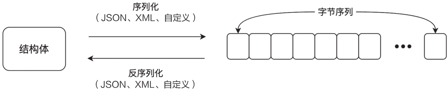 在Go语言中,通常会根据实际需求自定义复合类型,这通过使用struct关键字来声明。如果我们想要在I/O链路中传输复合结构体的内容,例如将一个结构体通过网络I/O发送到另一个进程,那就必须经过序列化和反序列化的过程。序列化可以采用多种格式,例如JSON或XML等。我们也可以自定义序列化的规则,结构体与字节序列之间的转换如图2-2所示。