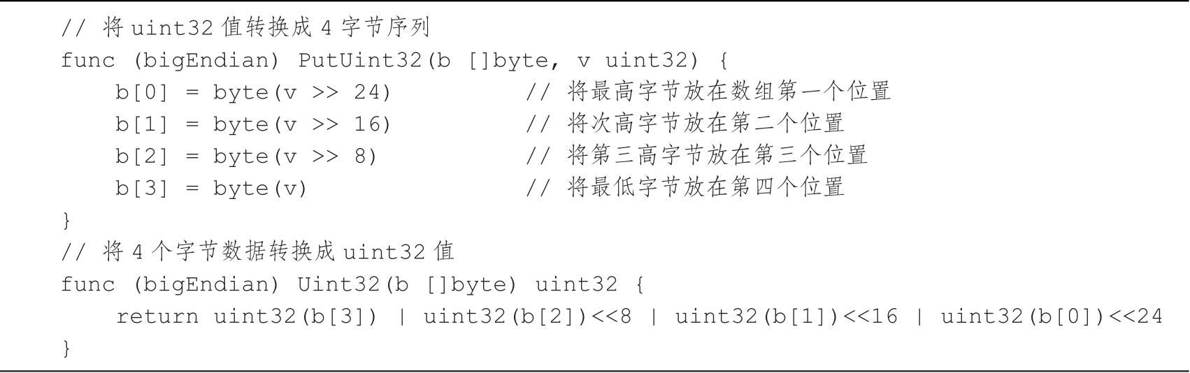 标准库对于大端序和小端序的实现是简单直观的。以大端序为例,它仅需将最高有效字节放置在数组的第一个字节,随后是次高有效字节,以此类推,直至所有字节均被处理。代码清单2-3展示了binary如何实现对uint32类型的大端序转换。