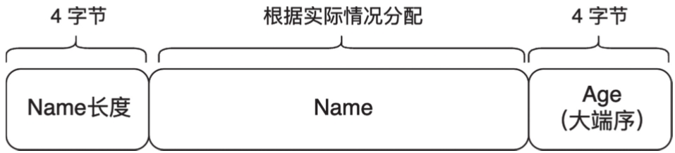 还是以Person结构体为例,我们的目标是将该结构体分解为一维的字节序列,同时确保信息的完整性。对于Person.Name字段,由于其内存长度不固定,在转换为一维序列后,需要用4字节来记录其长度。对于Person.Age字段,用4字节存储即可。对于整数类型的序列化,我们将采用大端序。Person的序列化规则如图2-3所示。