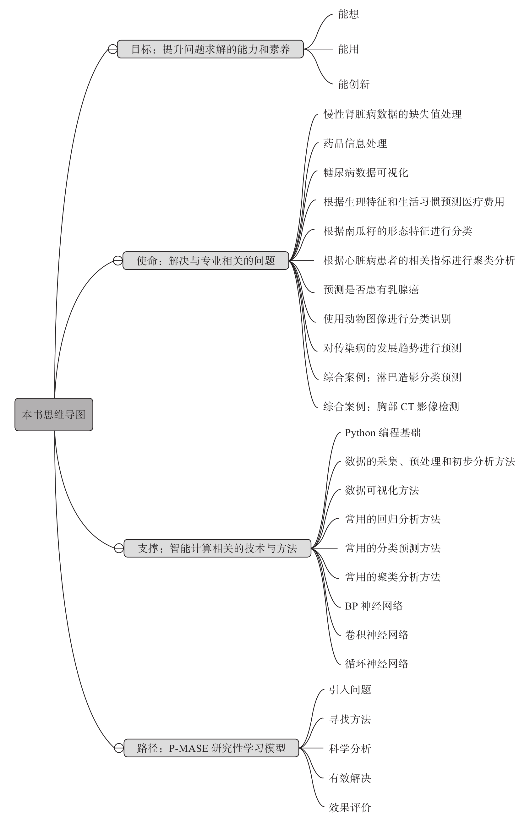 本书是以提高问题求解能力为目标、以解决专业相关问题为使命、以智能计算技术为支撑、以P-MASE研究性教学为路径而设计的。在教学过程中,教师通过各章的使命和综合案例,让学生自己发现问题并求解问题,提高学生利用智能计算技术解决专业问题的能力。从本书的思维导图中可以清楚地看到这四条思维分支。