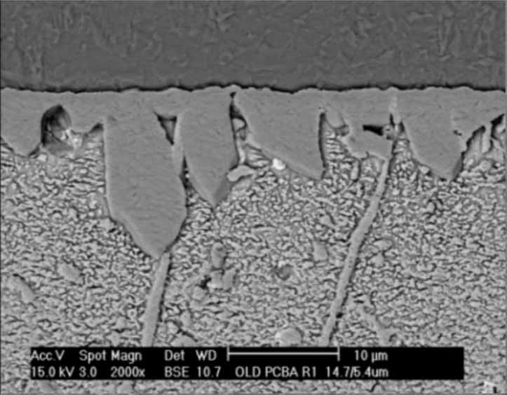 (2)切片分析:了解来料BGA与失效焊点的IMC形态。失效BGA断裂焊点的裂纹位于靠近BGA载板的IMC层根部,即IMC与Ni层界面,符合应力脆性断裂的特征。此外,还发现一点异常,就是焊点IMC呈“块状化”,而且异常厚,如图3-45所示,说明再流焊接时间过长。