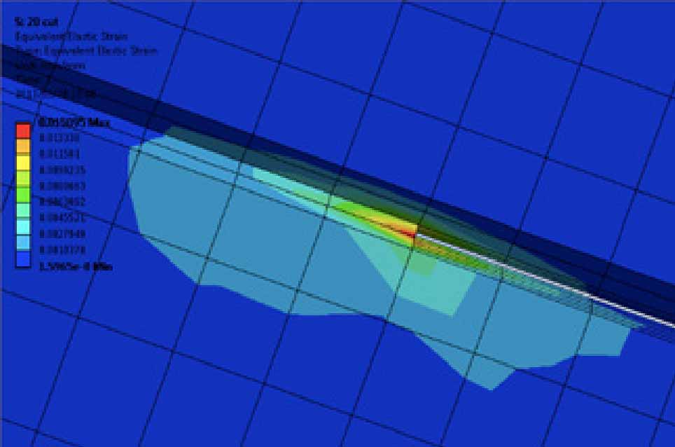 手工分板会导致PCB弯曲,机切分板会引发PCB的局部变形,这些作业很容易导致片式电容应力超标。图3-28是机切分板应变分析云图。从图中可以看到,应力范围基本靠近V槽方向分布,即应力比较大的范围或方向基本与V槽约呈45°。这说明对于机切分板工艺而言,元件相对V槽的布局方向与承受的应力大小无关,可以垂直布局,也可以平行布局。