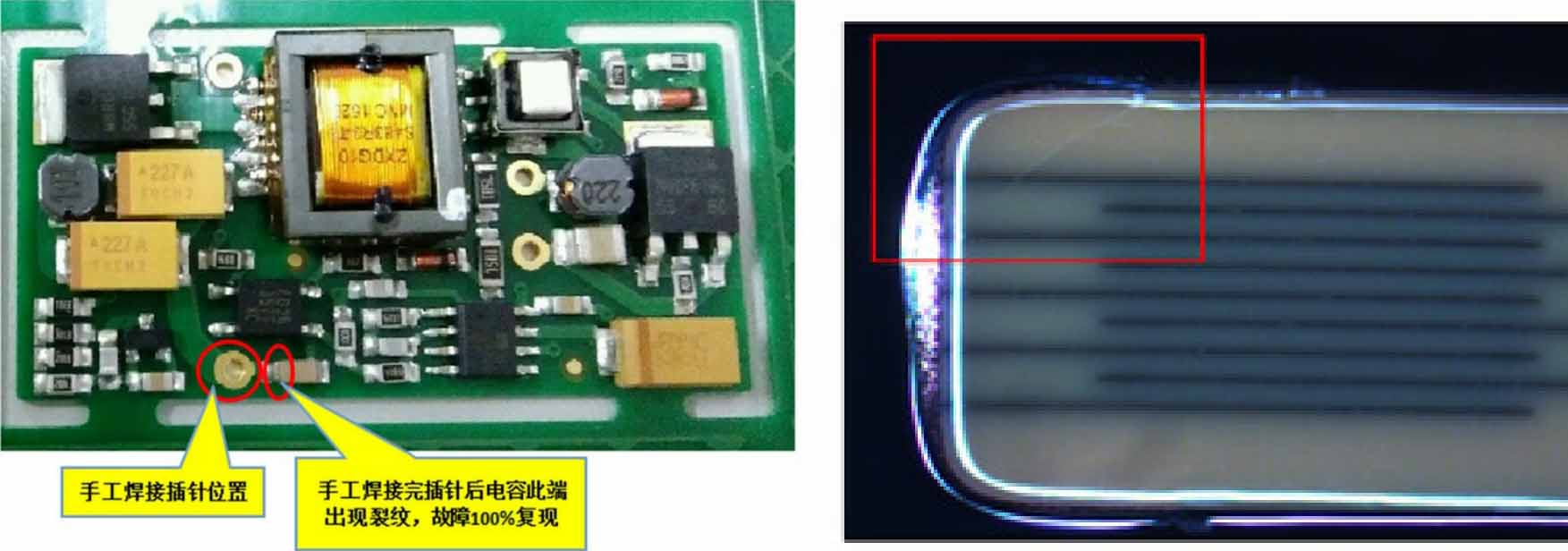 图3-33是一个实际的产品,手工焊接插针导致旁边的片式电容一端出现裂纹。