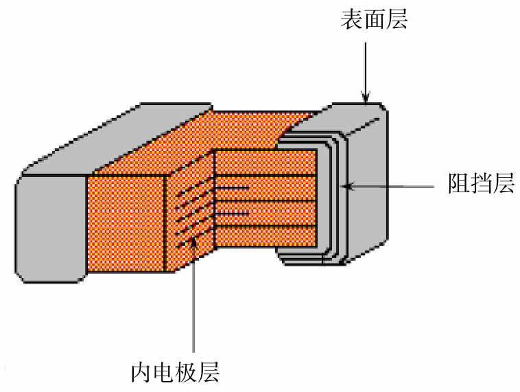波峰焊接、再流焊接、功率加载等,都可能导致片式电容上层与底层分层式开裂,如图3-36所示。这种失效多见于尺寸比较大的片式电容。