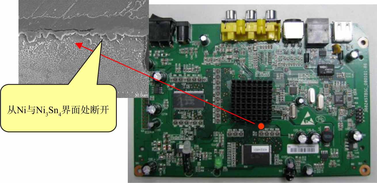 BGA焊点的应力断裂特征与应力源及其位置有关,一般具有明显的区域分布特征,断裂位置多从焊点界面断开,也可能从PCB次外层基材处断开。