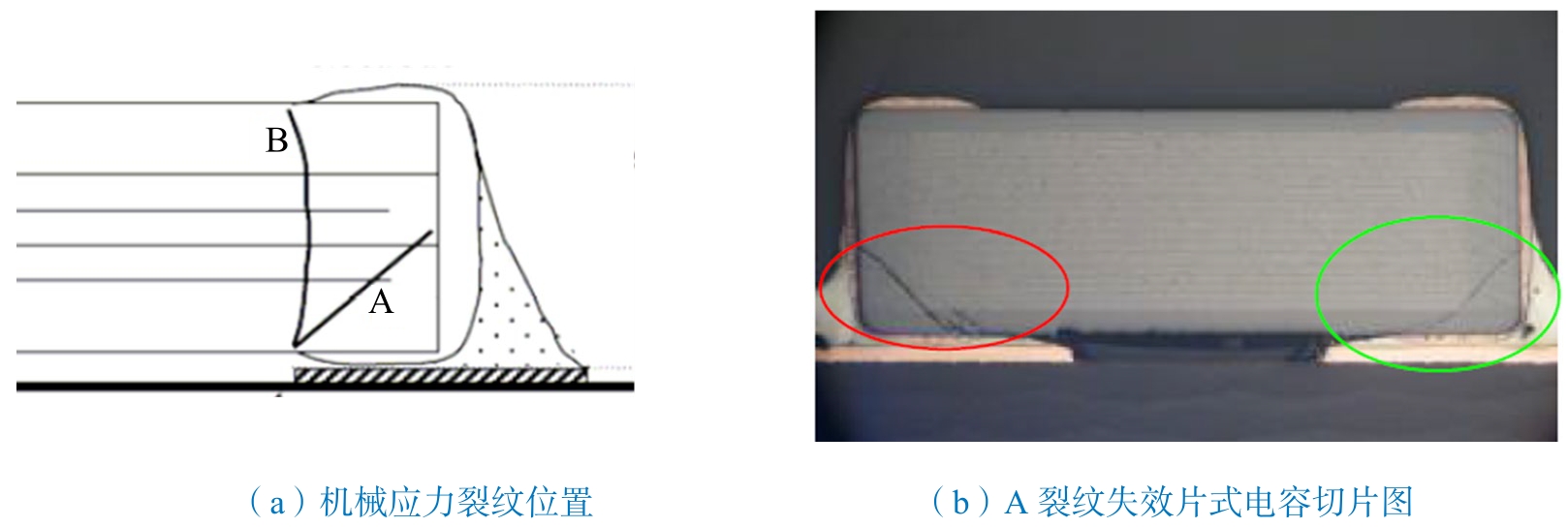 片式电容分板应力导致的片式电容失效具有典型的特征。如果片式电容比较厚、焊缝高度比较小,就会从PCB侧斜45°方向断裂,如图3-32(a)中的A裂纹。如果片式电容比较薄,焊锡包裹到焊端顶部,就会从本体纵向断开,如图3-32(a)中的B裂纹。图3-32(b)所示为A裂纹失效片式电容切片图。