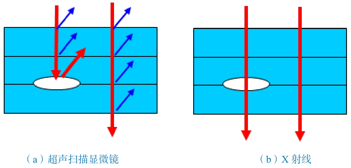 图4-15 超声扫描显微镜与X射线的工作原理对比