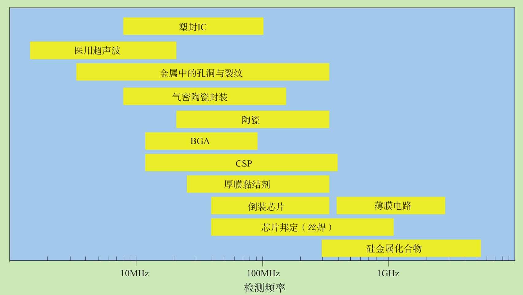 每个规格超声波传感器(也称为探头)的焦面尺寸是由传感器的频率、焦距和镜头半径决定的。传感器的频率越高,焦面尺寸越小,图像的分辨率也越高。在进行失效分析时,应根据分析的对象和要求,选择合适的超声波传感器,可参考图4-14进行选择。
