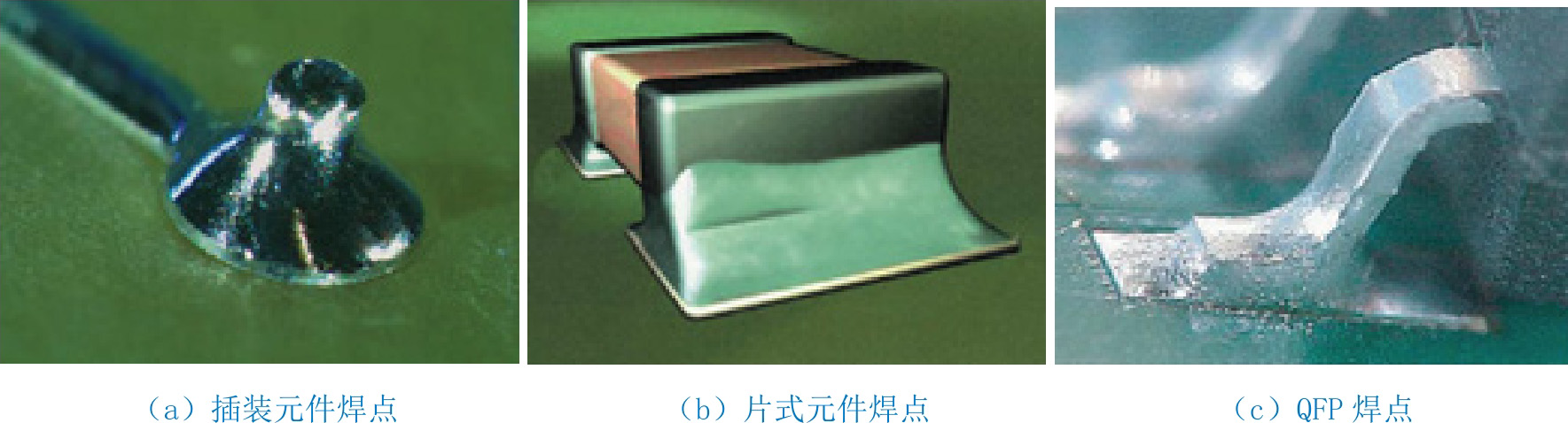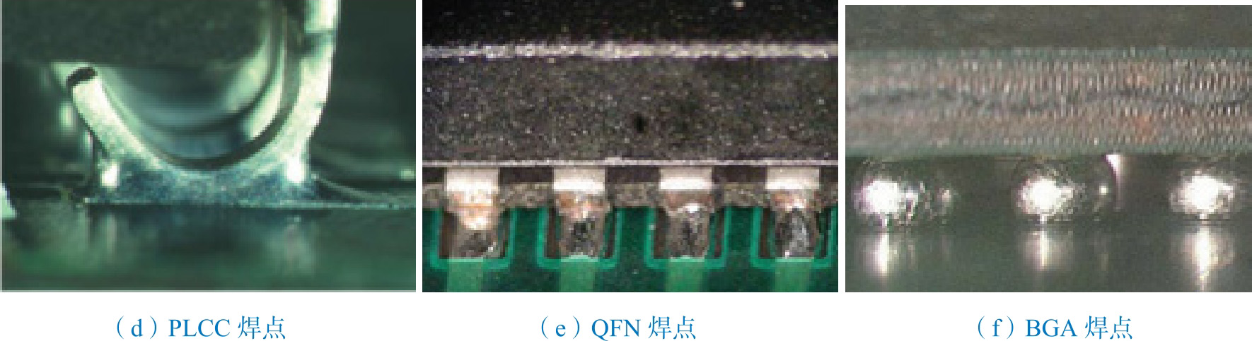 电子元器件的封装有很多类别,不同的封装其焊端或引脚的结构不同,因而焊点的形态也不同,如图1-1所示。不同形态的焊点,因印制电路板组件(Print Circuit Board Assembly,PCBA)在温度变化时受到的应力轴数与大小不同,其疲劳开裂的起始点以及裂纹形貌特征也不同。裂纹形貌特征(指切片图反映的形貌)是分析焊点开裂原因的重要判据之一,将在后面两章中详细讨论。