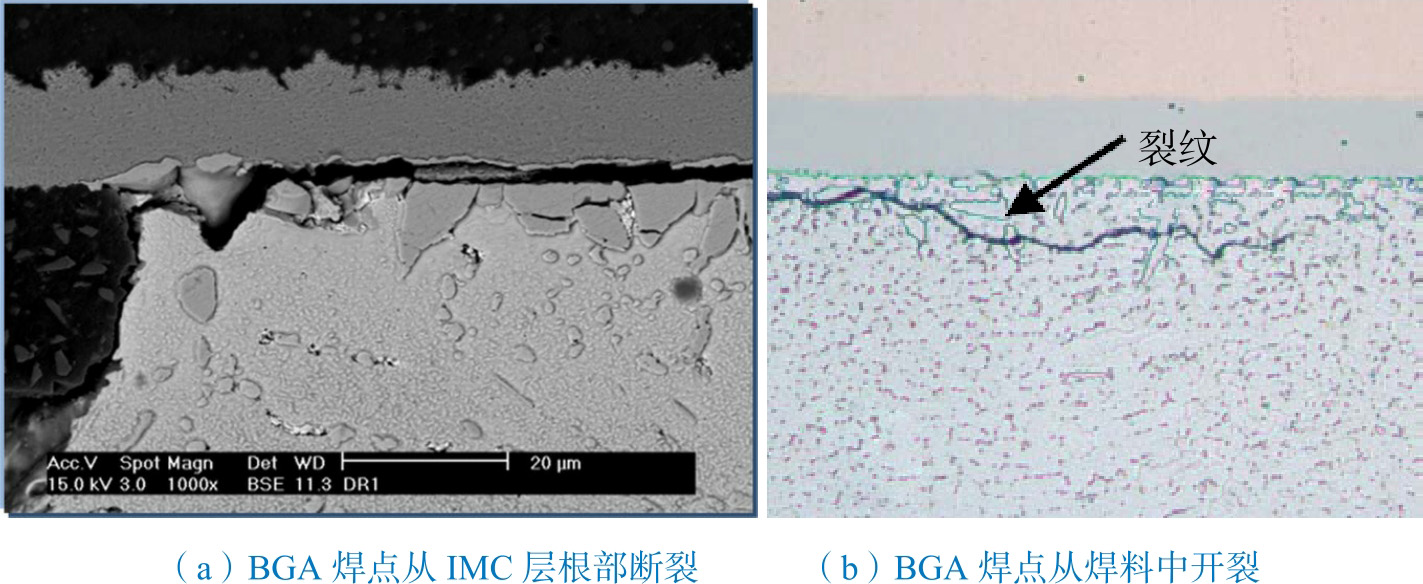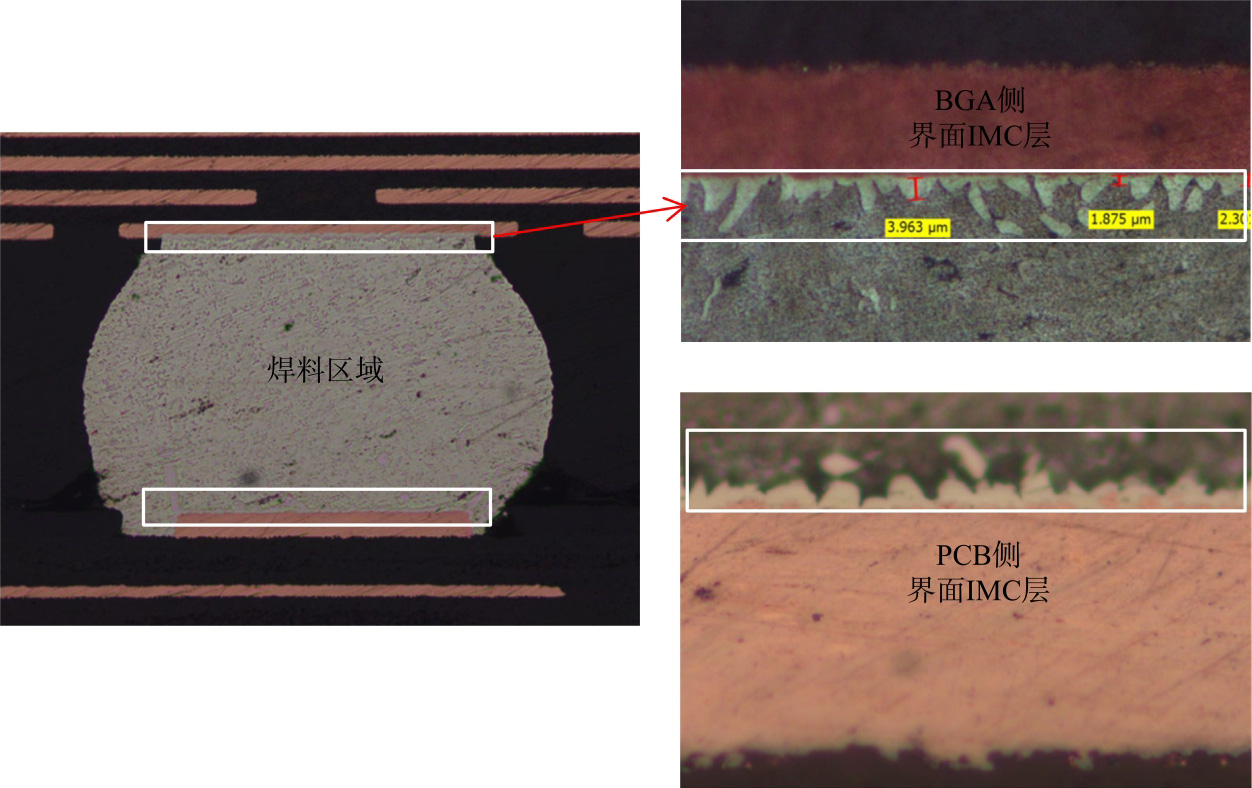 从微观组织上看,焊点具有明显的三部分,即与PCB焊盘形成的界面金属间化合物(IMC)层、与元件引脚/焊端基材形成的界面IMC层和中间的焊料区域,如图1-2所示。由于这3个区域金相组织不同,因此也形成了机械性能不同的3个区域。在不同的负载条件下,焊点的开裂位置也呈现出一定的规律性,即由温度循环(热机械应力)导致的裂纹通常出现在焊料区强度比较弱或应力集中的位置,而由机械应力(如冲击、PCB瞬时弯曲)导致的裂纹通常出现在界面IMC与基底材料的界面。
