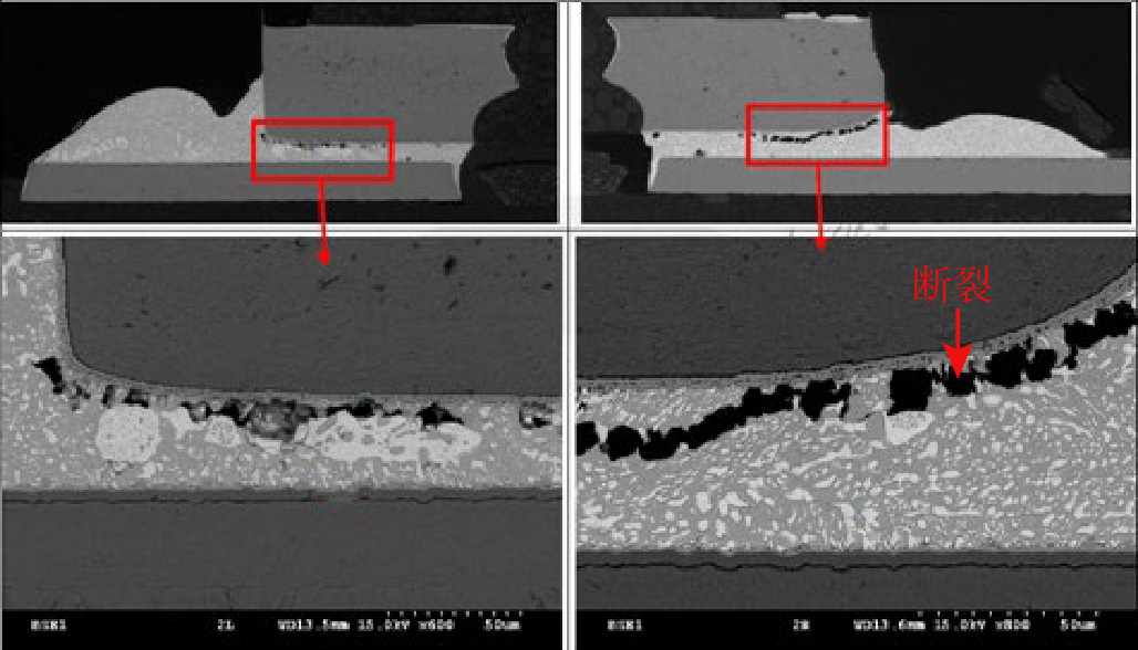 由于界面IMC层的热膨胀系数与焊料的热膨胀系数有较大的差异,且界面IMC层比较硬脆,因此界面IMC层成为影响焊点可靠性最重要的区域。从统计数据来看,如果界面IMC层比较厚,会降低焊点的强度,减少具有延展性的焊料区域的体积,使得焊点比较容易发生开裂。因此,对于焊点可靠性而言,界面IMC层的厚度与形貌是最大的影响因素,也是制造工艺应重点关注的地方。