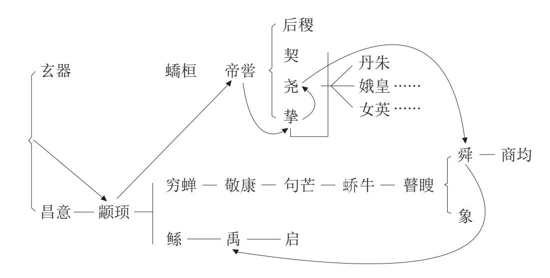 这样看来,则黄帝一传其孙颛顼,颛顼再传其“族子”帝喾,帝喾三传其子挚,挚四传其弟尧,而尧则五传其玄孙舜,舜则六传其高祖禹,如此,则不仅尧、舜禅让为高祖与玄孙之递嬗,而舜与娥皇、女英之婚姻,亦为与其曾祖姑之血族婚。