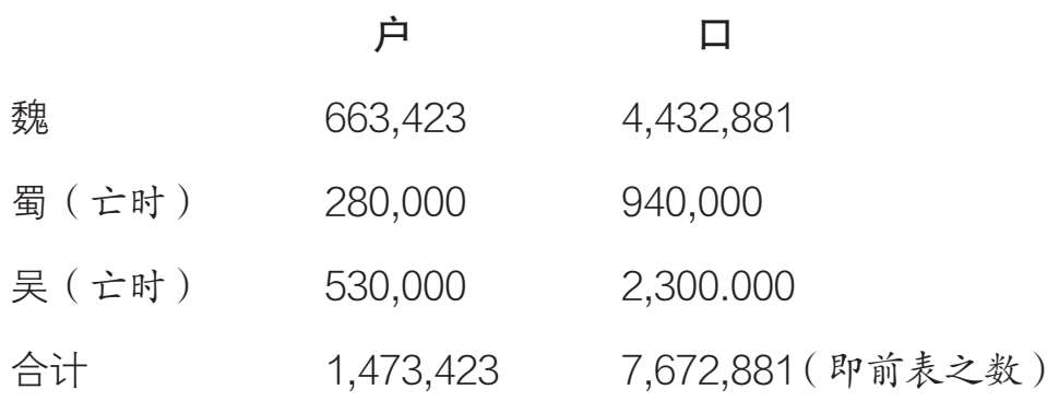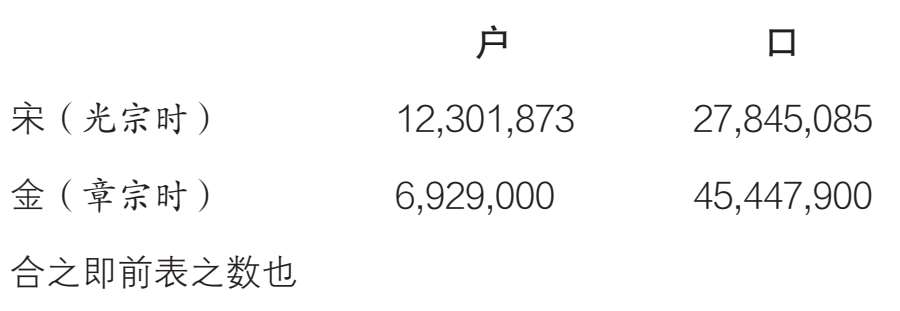 四、当数主分立时代,必须合观各主所属之户口,乃为全国总数。下表所列者,惟南宋高宗时代,未将金所属列人。其时金之户数三百万,合诸宋之数共一千四百余万户也。口数则原书不载,无从搀入,故阙之。其余如三国时、六朝时及南宋光宗时,皆综合其总数列表。所据者如下: